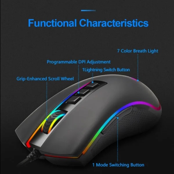 • RGB Backlighting :The mouse features RGB backlighting, adding a touch of style to your setup and making it easier to use in low-light conditions.